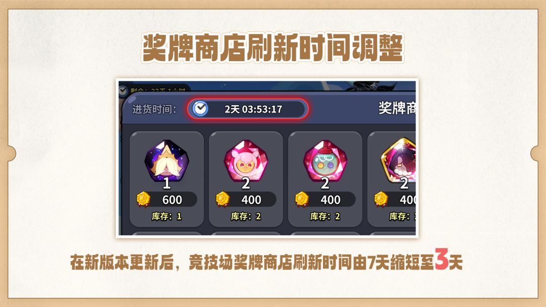 在新版本更新后,竞技场奖牌商店刷新时间由7天缩短至3天。