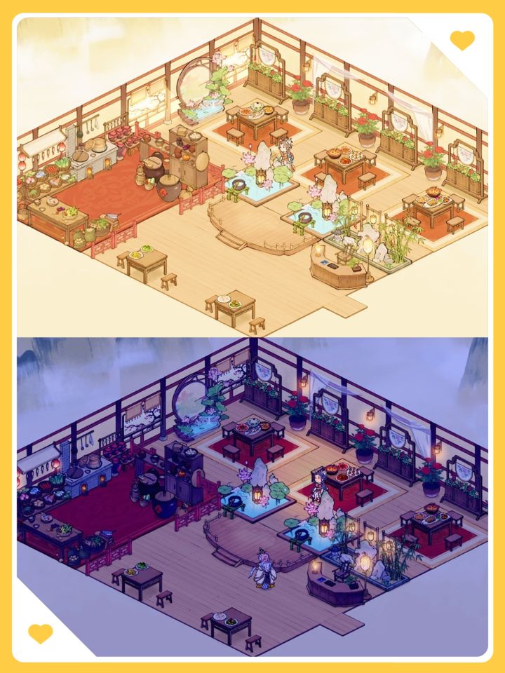布局思路是按以前玩过的餐厅游戏弄的,然后小农没有楼梯就采用台阶充当楼梯,弄个二层餐馆,就是走路有点卡脚