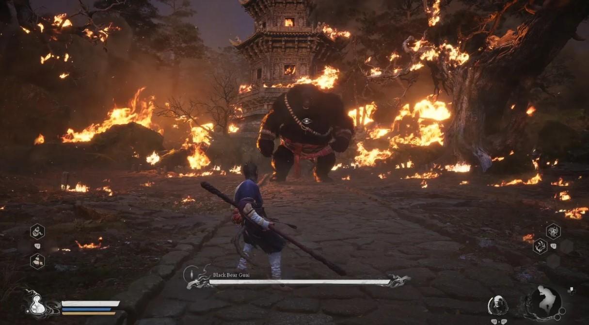 火焰附体强化:在上述所有技能的基础上添加火焰伤害,威力更为巨大。带着火风的拳头,带着火焰的拍砸,此时的天命人不能恋战,需用利用变身技能以及定身术、二段棍法打断其攻势,尽快解决掉黑熊精。值得一提的是,金池长老击败后留下的法器:辟火罩能够有效预防四周的火焰,提升自身火炕,是不错的应对手段。
