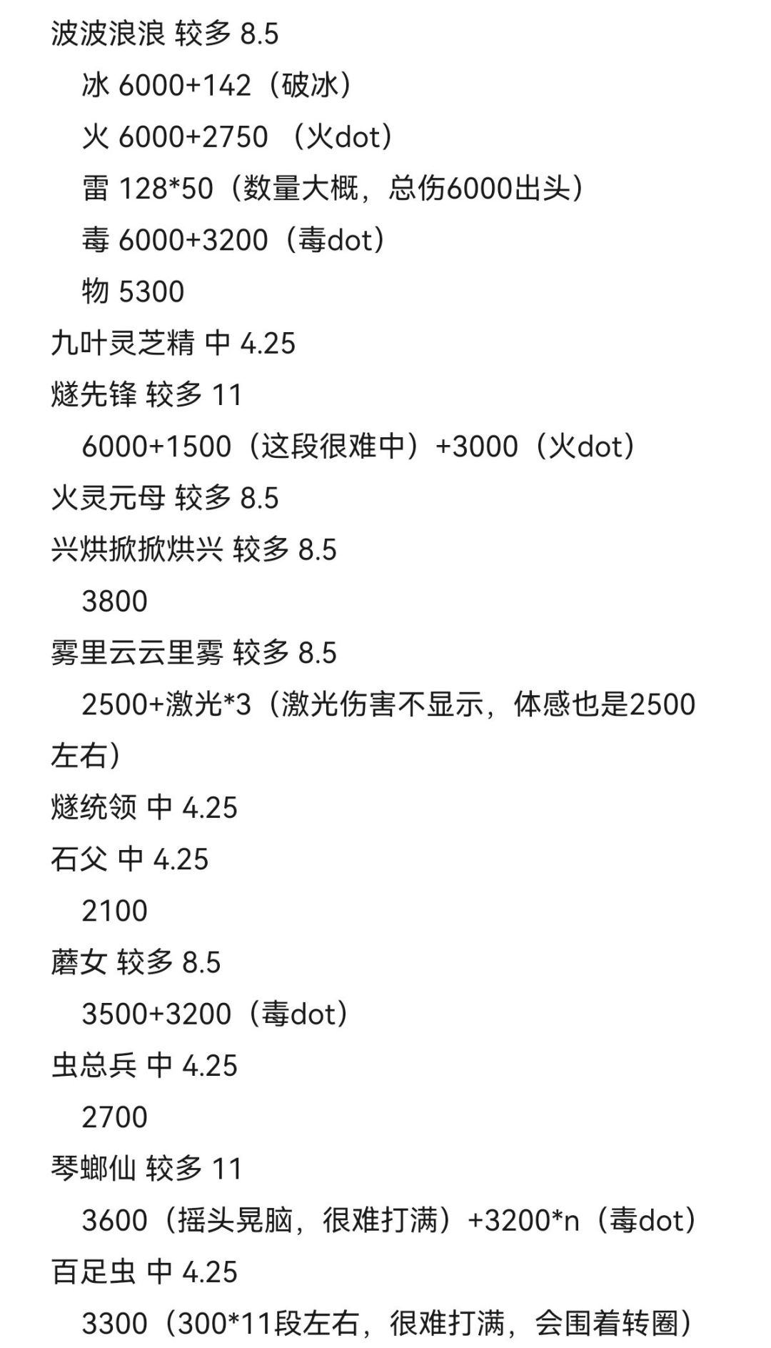 2.伤害测试通过我义眼盯帧,多段伤害累加计算,由于黑神话本身有伤害波动,因此伤害精确到50,可能存在几十点误差和波动(伤害高的精魄波动可能有两三百),有些精魄有多段伤害很难全打满,我会测试多次,分别记下每一段伤害的数值,最后加起来