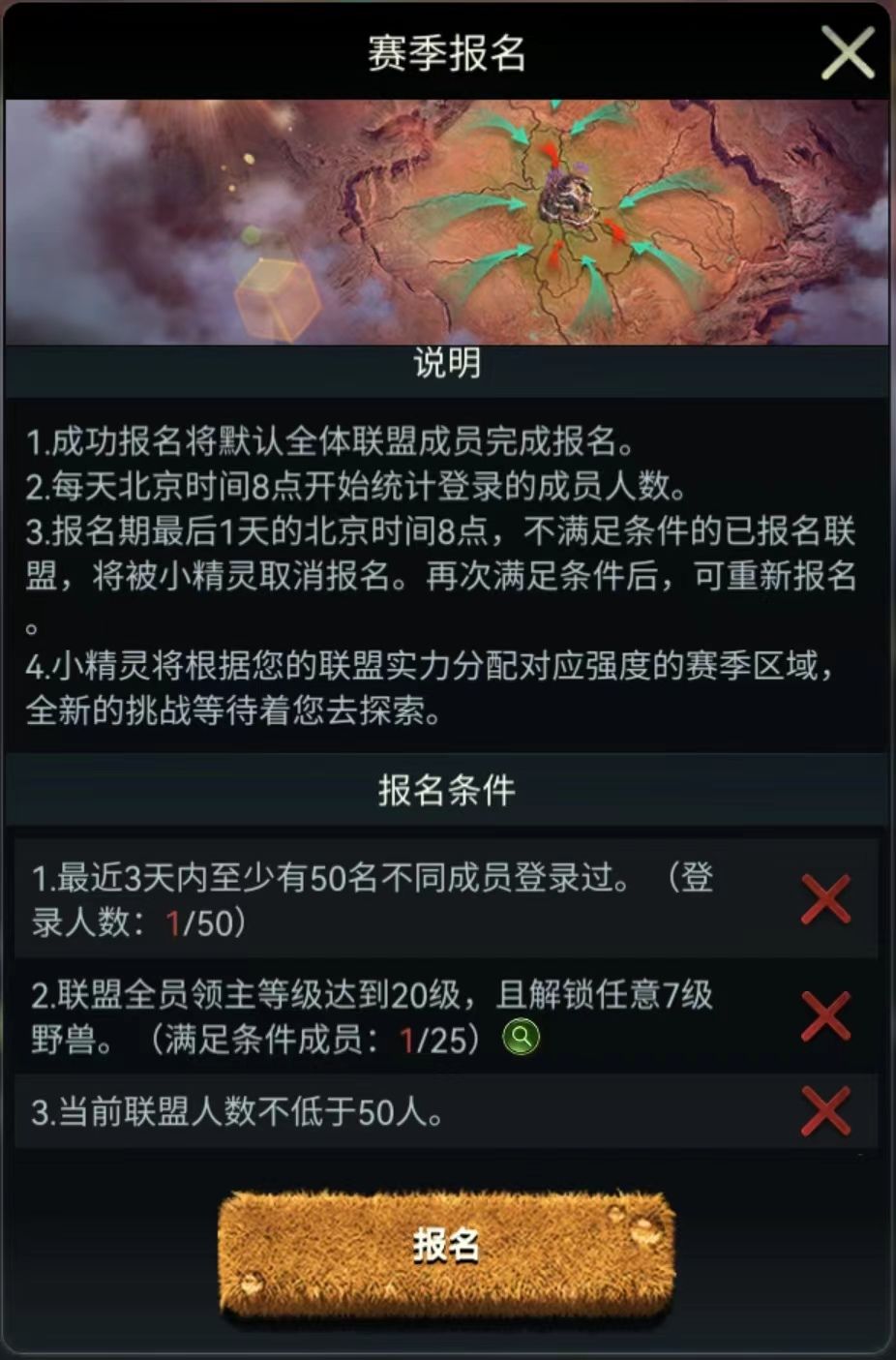 2:联盟最少50人满足上岛条件,且3天内最少50人登录