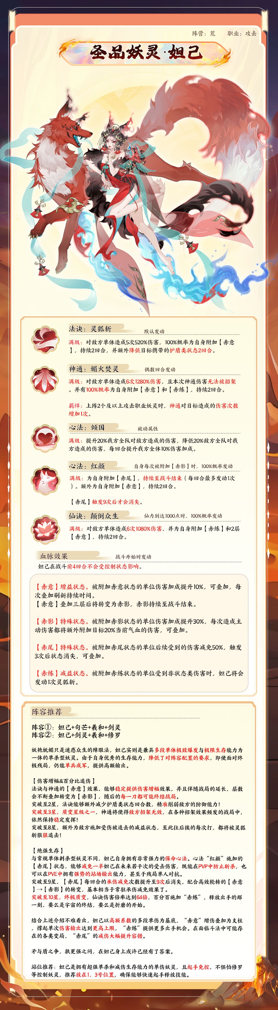 ●神通·媚火焚灵:对敌方单体造成5次640%伤害,并有100%概率为自身附加【赤意】,持续2回合。