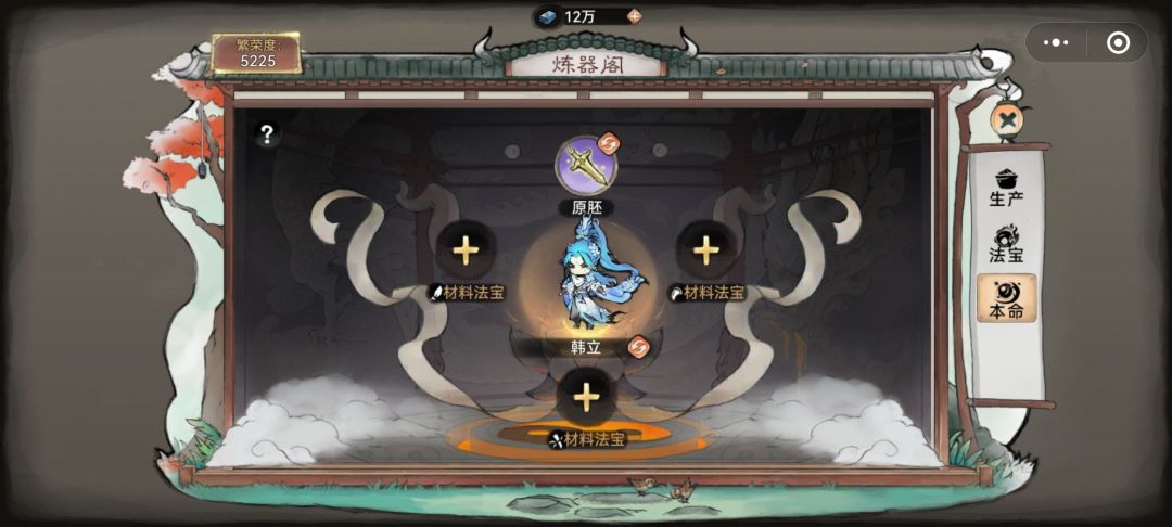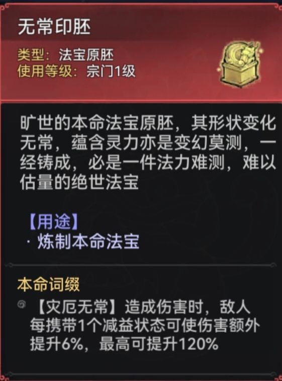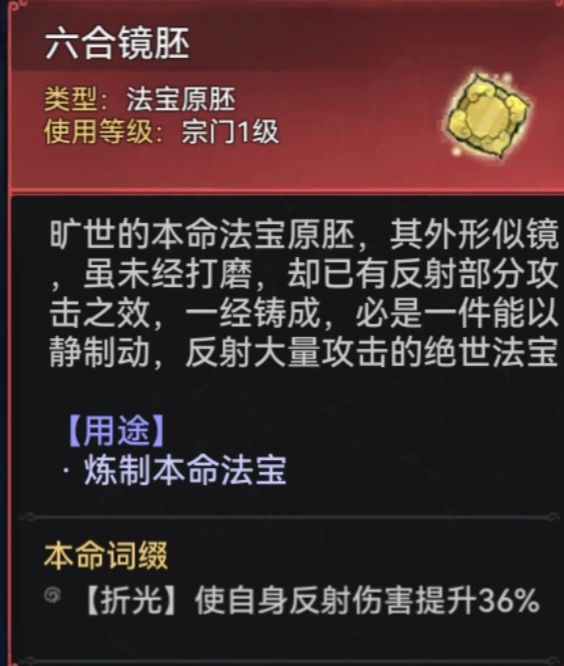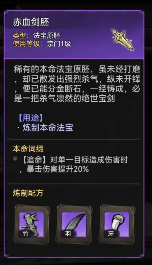 本命法宝胚子分为紫、金、红,紫色本命可以放置(紫色、金色、红色法宝炼制),金色本命可以放置(金色、红色法宝炼制),红色本命只能放置红色法宝炼制,每个本命胚子都会附带3个炼制材料选择