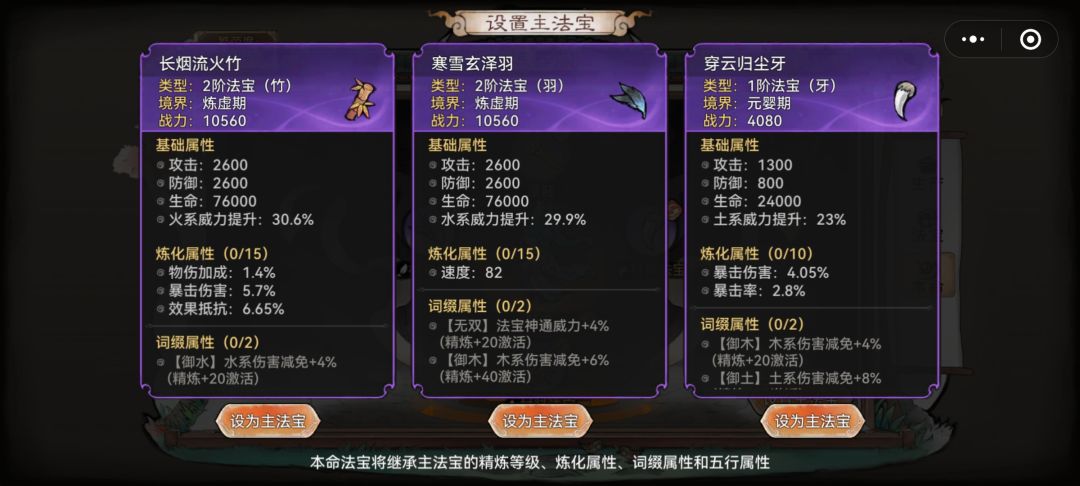 主法宝选择我们需要的元素属性(选择三阶做为主法宝),副法宝可以选择我们需要的技能(一阶、二阶也是有一些不错技能的法宝)
