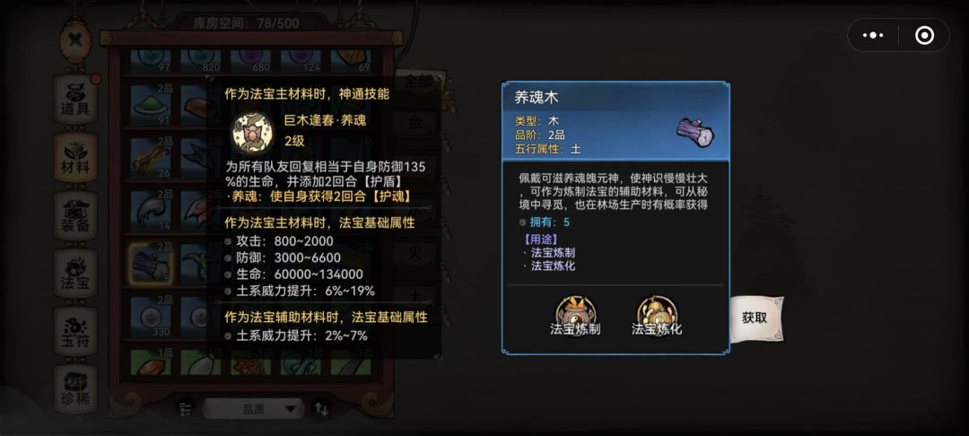 以木头为例,两个技能是一样的这是基础数值不同和额外的效果不同,三阶为睡眠buff,二阶是自身复活buff,这样看二阶木土技能更强,所以副材料我们可以选择技能更强的法宝