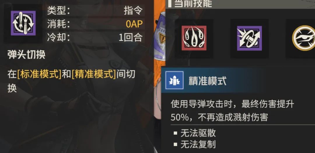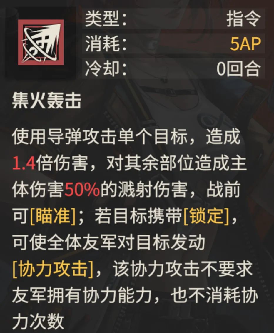 首先第一个......一马当先的技能便是【集火轰击】,这个技能的机制挺不错,是游戏中少有的可以直接瞄头的技能之一,伤害看着也还行,1.4倍伤害搭上瞄头也完全能接受了,不过......最大的问题就是这个5AP的消耗,经过实测这个技能在战斗中的收益其实并不算高,本质原因就是AP轮转不过来,每回合自动回复4点AP,然后γ2区给升到16算力可以协力回复1点AP,这样才能勉强一动打出一次此技能,但第二发就很有可能熄火了,所以如果这个技能可以改为4AP消耗的话,维一感觉其收益会提升不少。