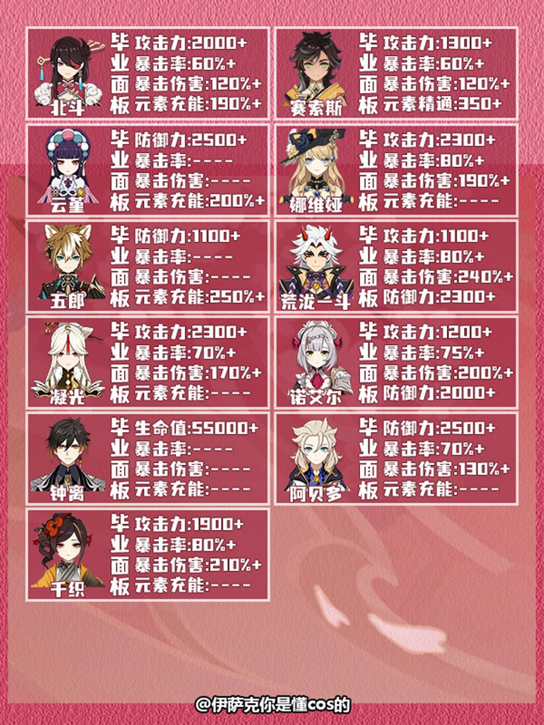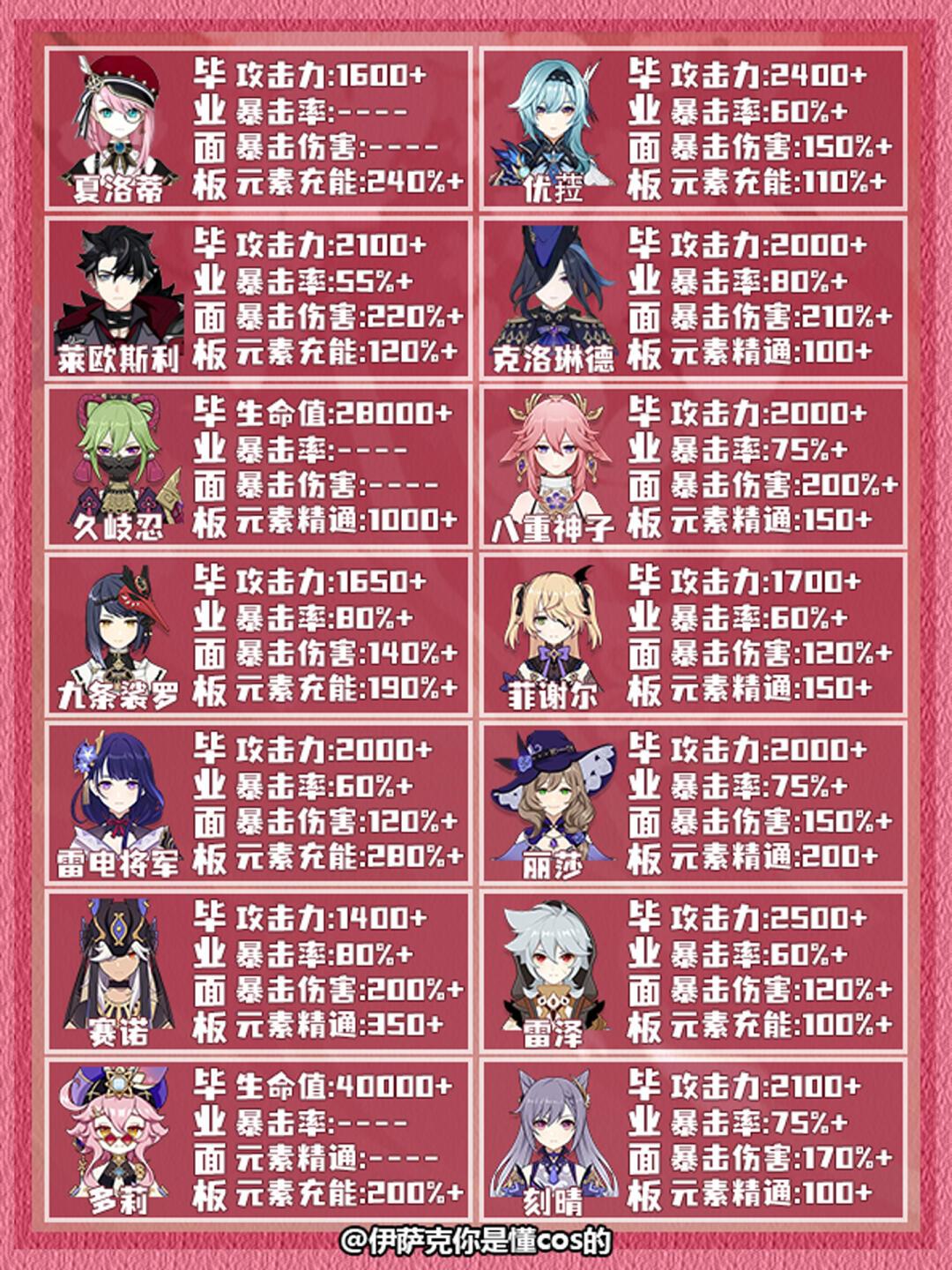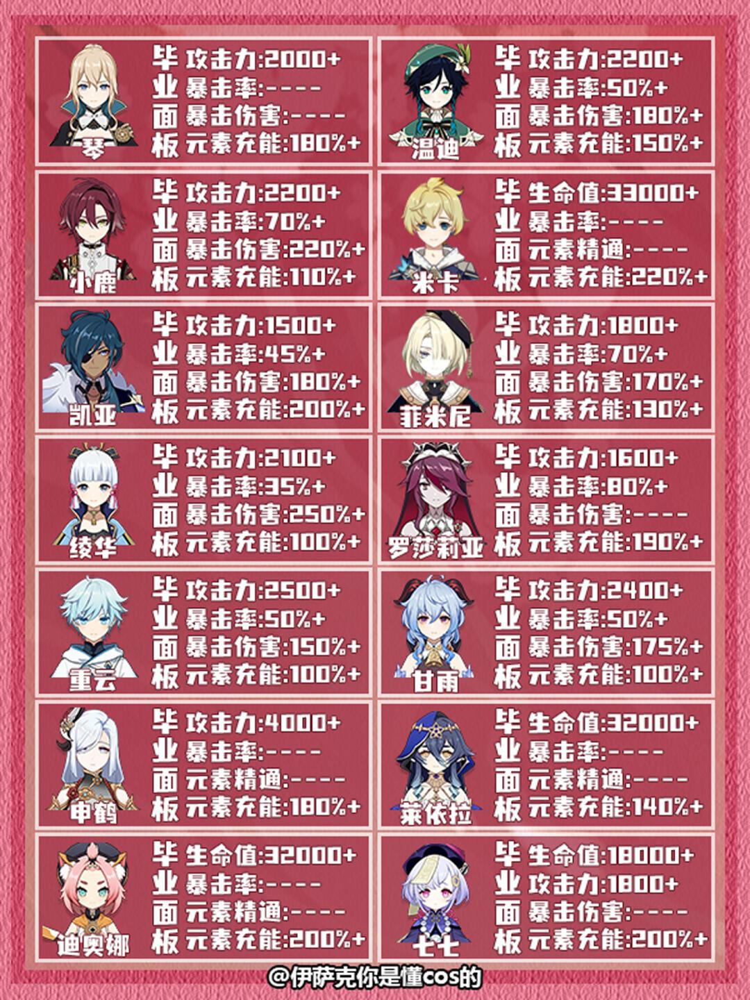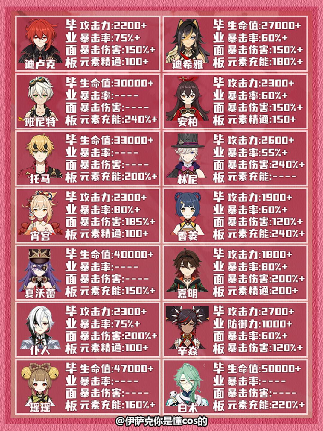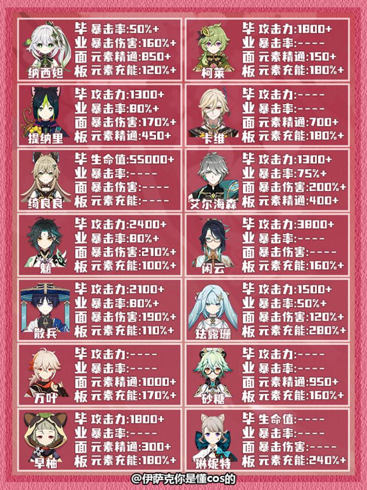 本期给大家带来的是原神全角色毕业面板参考推荐