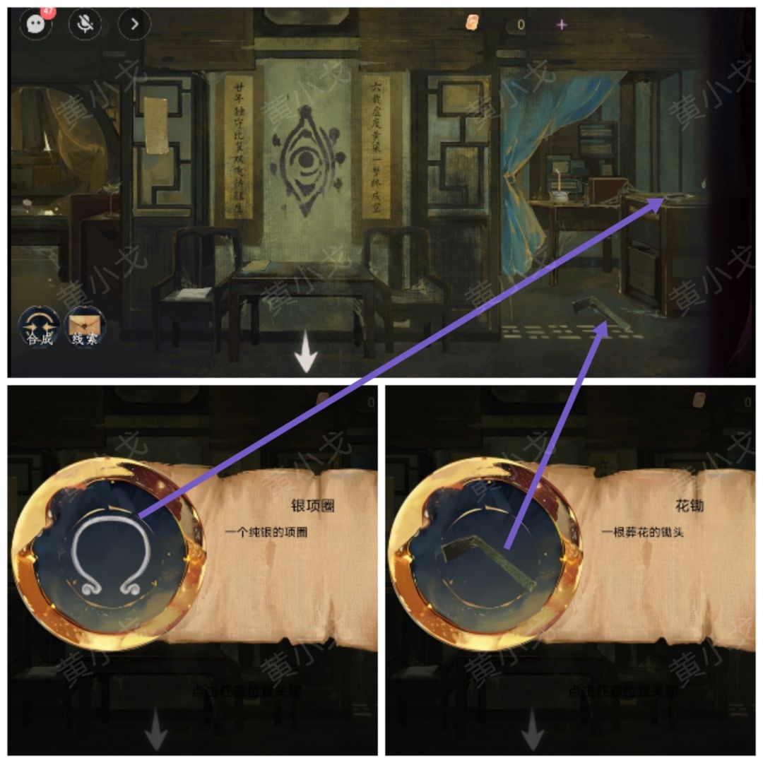 2.点击获取右侧书桌上的【胎毛笔】和【燃香】(注意地上的八卦图案,然后告诉队友:长短长、长长短、短短长、长长长、长短短)
