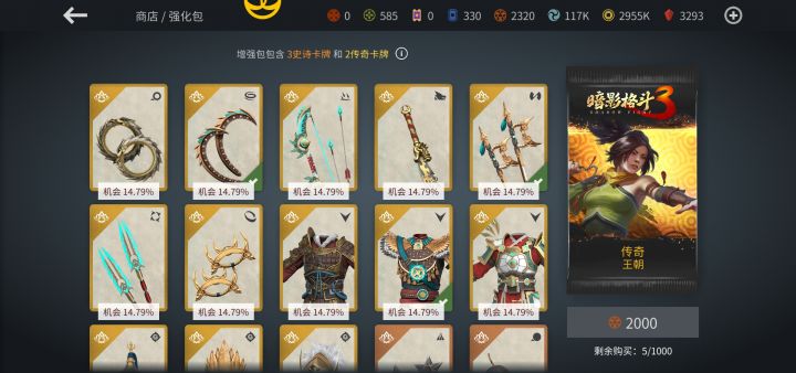 新章节的套装差军团的,其他两开齐了,不过感觉还是没篡位者轮椅,目前最轮椅的套装就是篡位者,地雷套次之,建议新玩家可以先推到第六章,直到商店王朝包变成图3这样,然后把主界面奖励换成王朝,再开始开箱子和活动卡包,王朝包3个套装都很强力,出哪个都不亏,3套开齐直接躺平,篡位者套打活动突袭,追星者套打神级主线。而其他两个派系里面还混了套白板,怎么开怎么血压高