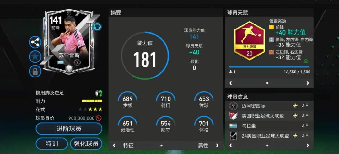 美职联苏亚雷斯客串边锋表现出色,天赋方面,他配备了强力锋霸,对他的加速、射门、抢点、头球、力量五项数据都有一定提升。花式方面,三星花式星级的苏亚雷斯基础花式为马赛回旋,具备稳定的边路突破能力。