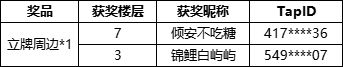 恭喜以上幸运玩家中奖!辛苦各位玩家在七个工作日内添加联系方式QQ:2168413763,添加时需要备注【TapTap+游戏名+活动简称】兑换奖品哦~(7个工作日内没有联系工作人员视为放弃奖励)