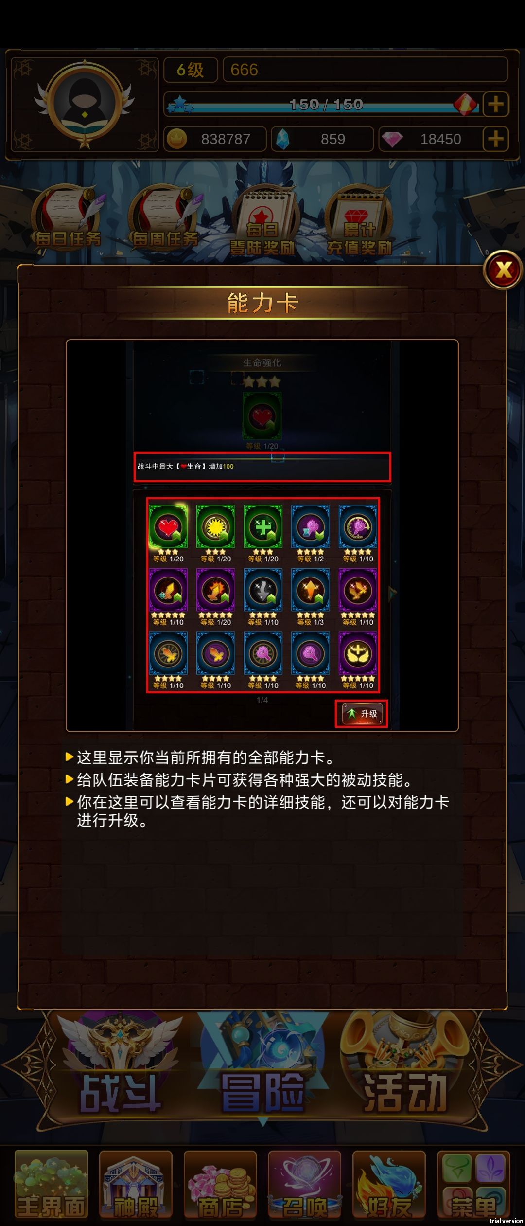 《问答英雄》的能力提升方式有:英雄、武具、能力卡、知识升级