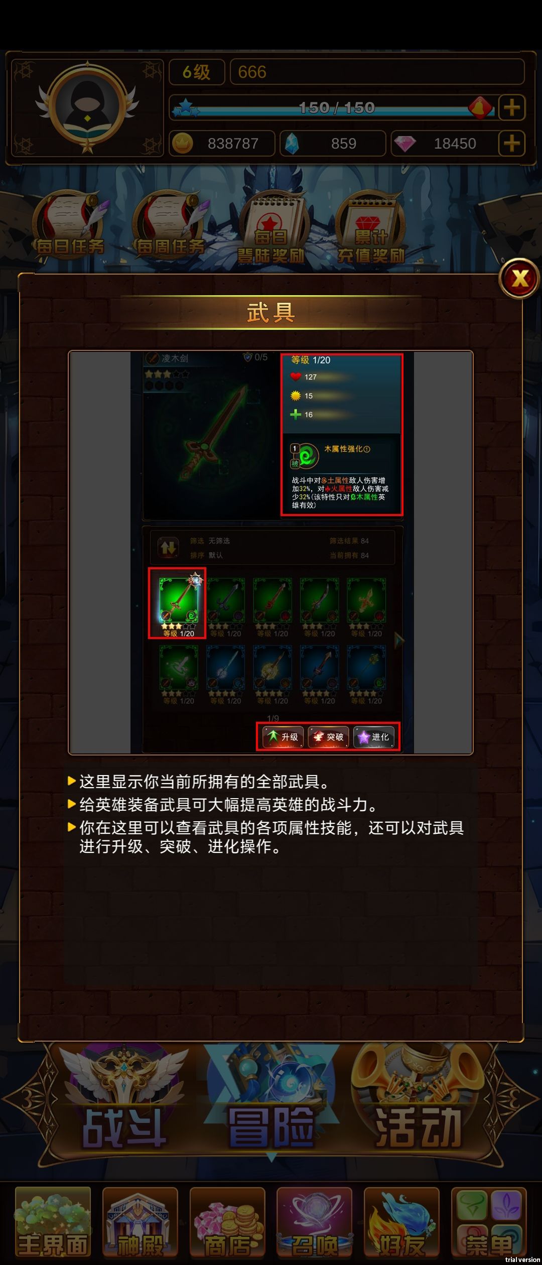 武具:每种武器都对应一种专属效果,与英雄角色或属性匹配可激活专属效果,大幅提升战斗力。