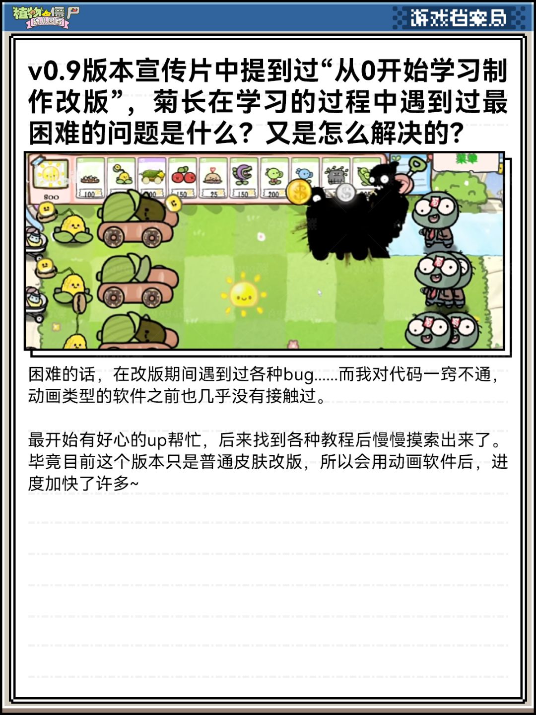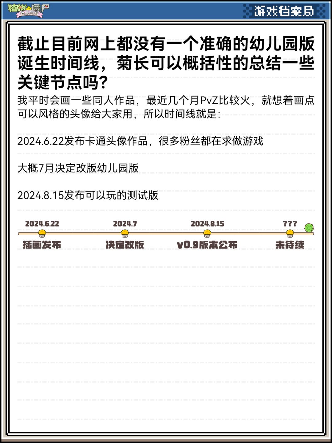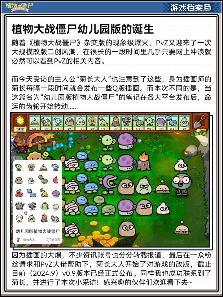 因为插画的大爆,不少资讯账号也分分转载报道,最后在一众粉丝请求和PvZ大佬帮助下,菊长大人开始了对游戏的改版,截止目前(2024.9)v0.9版本已经正式公布。同样我也成功联系到了菊长,并进行了本次小采访!感兴趣的伙伴们欢迎看下去~