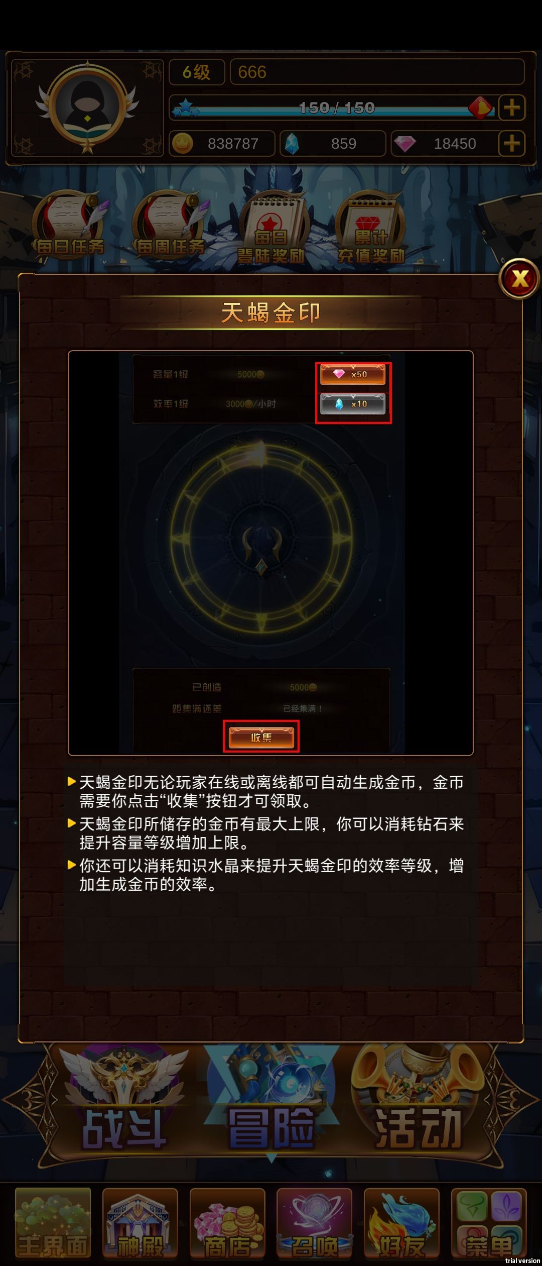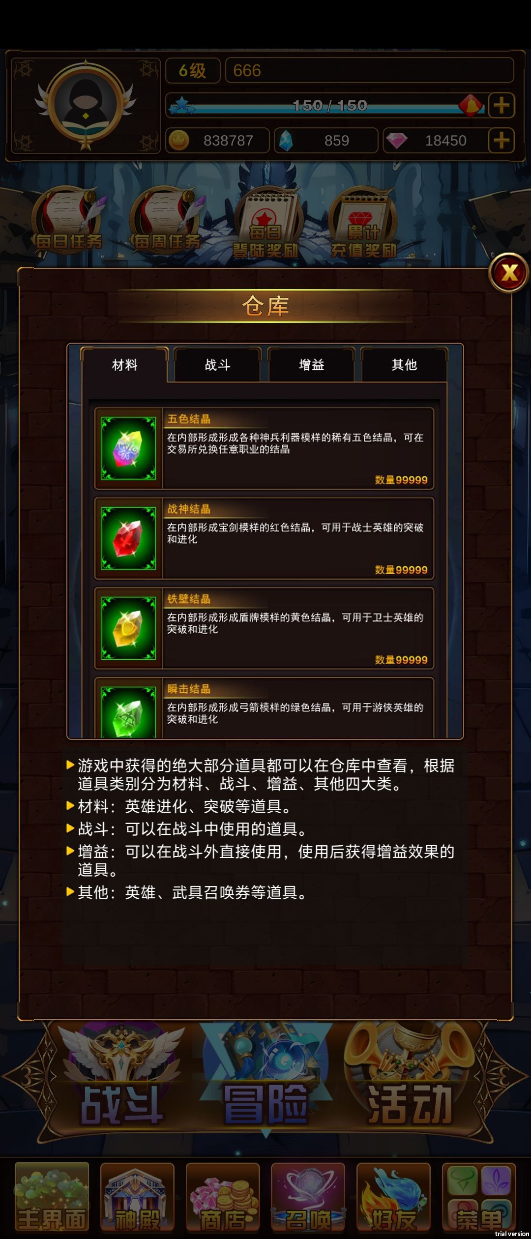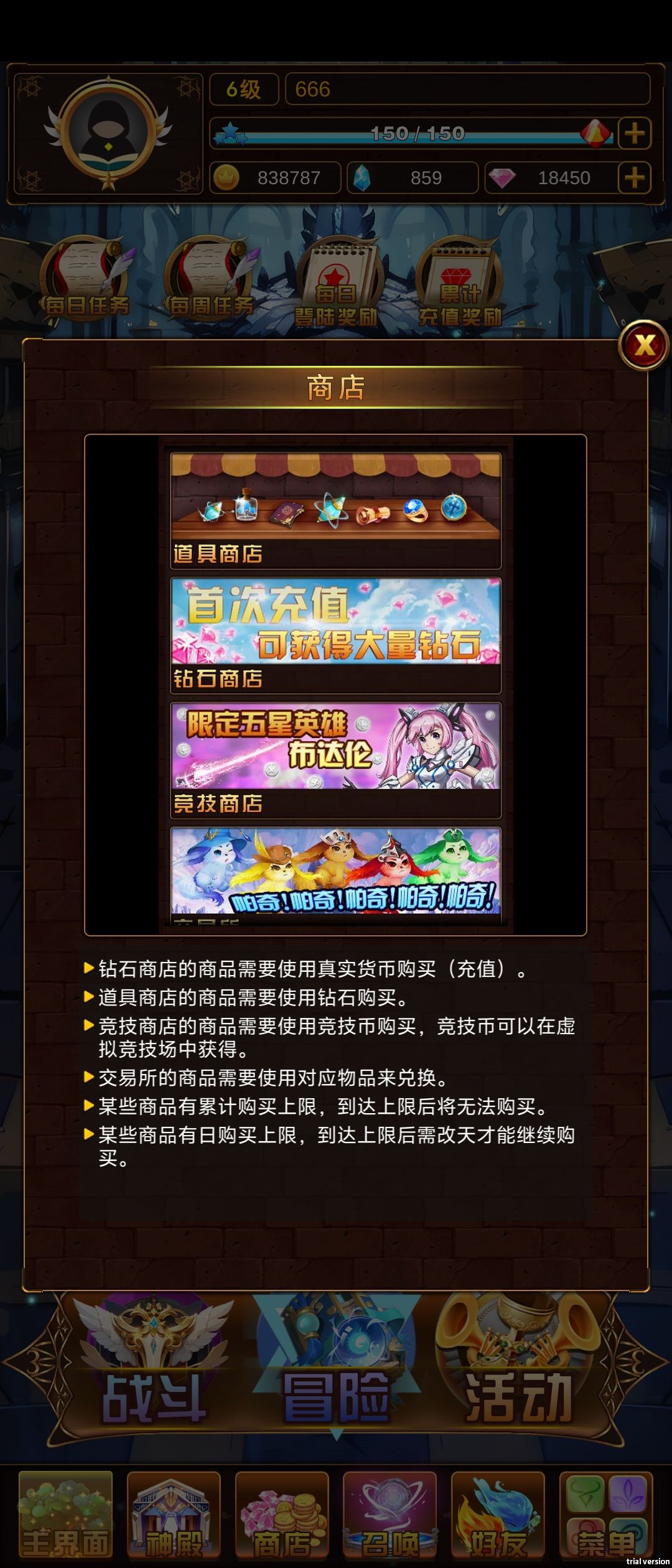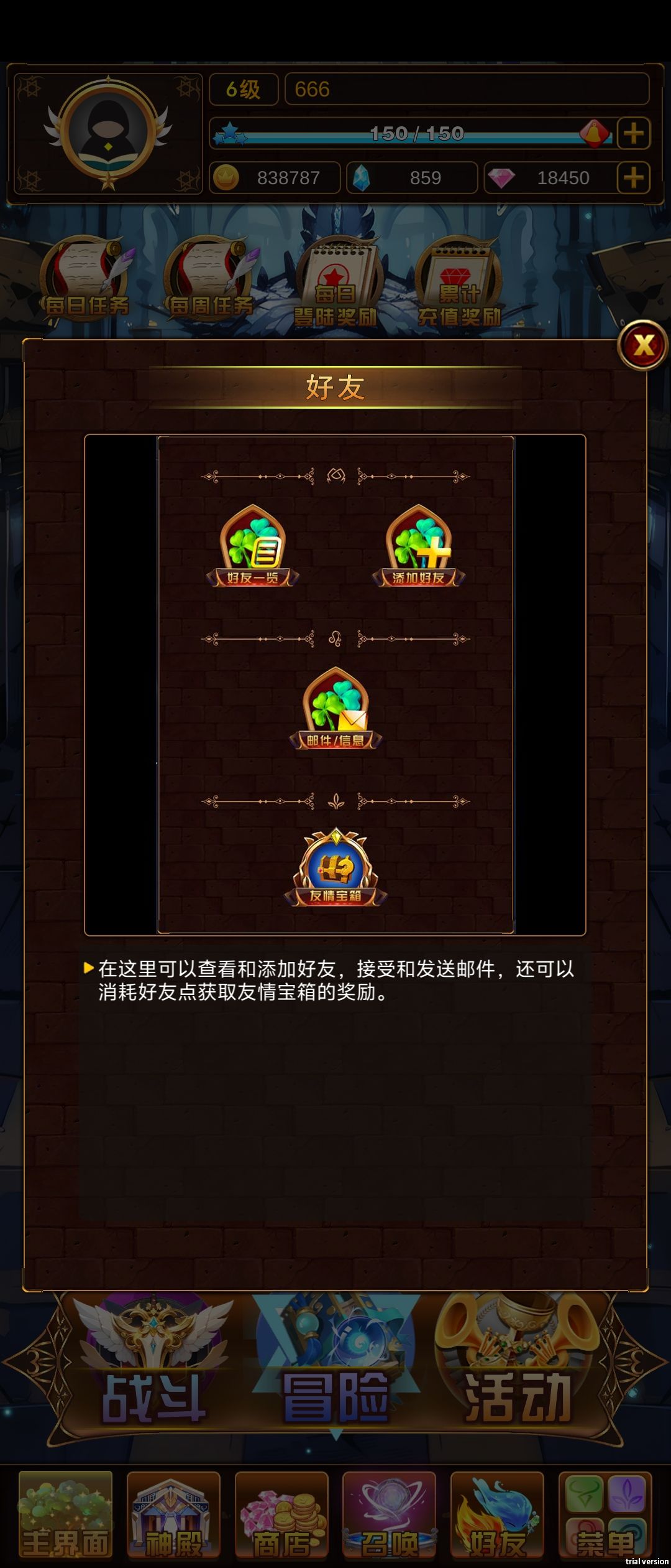 《问答英雄》的系统功能包括:神殿、商店、仓库、召唤、金印、好友