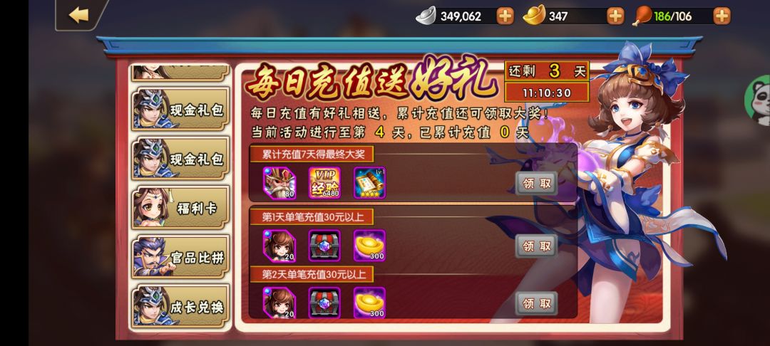 土豪玩家:建议第一天就搞648(不要买现金礼包直接充先领了优惠券再充值可以少很多💰)搞个神将箱子选神诸葛,(神诸葛要趁早养) ,后面就每天充30拿下第七天的神赵云(期间你们可以看着搞其他活动但别搞太多把钱留在后面),之后第二周没有任何活动是过渡周,第三周开始之后可以拿几次七日累充,和充值排名可以搞几次只要198(第一名有10万经验150个神赵云碎片