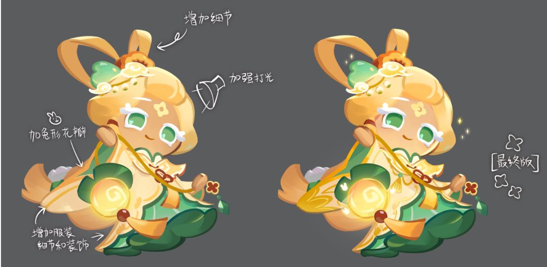 2、之前有了解到大家对金桂饼干的面部颜色和原本有些出入,我们决定还原金桂的美貌!使用最原始“打光”的方式提升亮度、加深碧绿瞳色,让整体立绘看起来更为和谐。