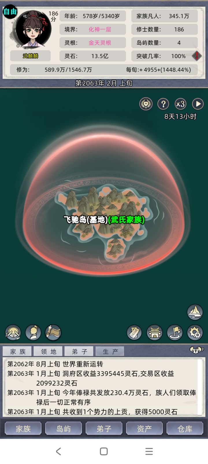 注意:一个岛屿只可以有9个洞府区,9个交易区,你如果想要赚更多钱,可以去占领领土,多搞洞府区和交易区,这么做了你就发现灵石根本用不完了