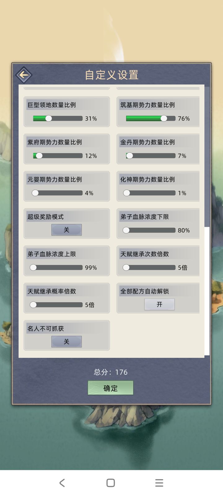 如果是自由模式,那么需要把名人可抓捕设置成关,尽可能的把前期紫府和金丹概率降低,因为太高了你会无法抓名人,具体看图二设置。