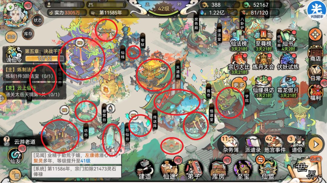2.商市,坊市,引仙台,悬赏台,仙栈等都是CD短需要频繁上线的任务建筑,按个人喜好摆在离宗门门口最近的地方