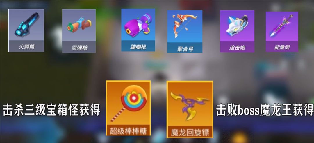 魔龙回旋镖原形为金库攻防星辰圣女的武器。碰到墙或到达距离后会返回于自己身边,一来一回最高可造成144伤害。获取方式为击败魔龙王获得(注:一般来说一局场上只有一个,有时可能会有两个,是根据攻击魔龙王的人数来掉落的)