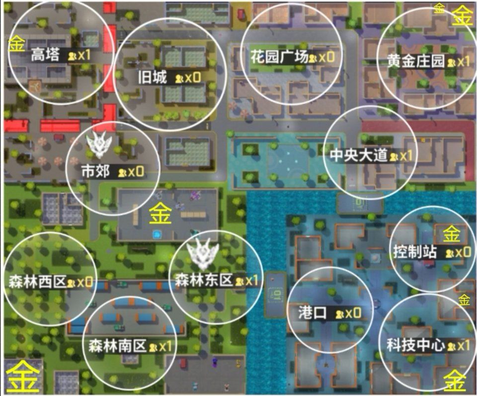 不同的武器也适合不同的发育:例如聚合弓适合猥琐发育,火箭筒适合主动出击,蹦嘣枪则根据自己的物资来选择自己的发育。开局选地也很重要,猥琐发育适合选黄金庄园、港口等宝箱物资较多的地方;主动出击可选择高塔等人较多的地方,不过并不推荐。市郊和森林东区是魔龙王常刷新的地方,想打魔龙王的玩家可以选择开局选在这些位置。在这些位置中,高塔、黄金庄园、控制站、等地是容易刷金宝箱的区域,选地时可以优先考虑。(下面是一个简略图,可能不够详细)