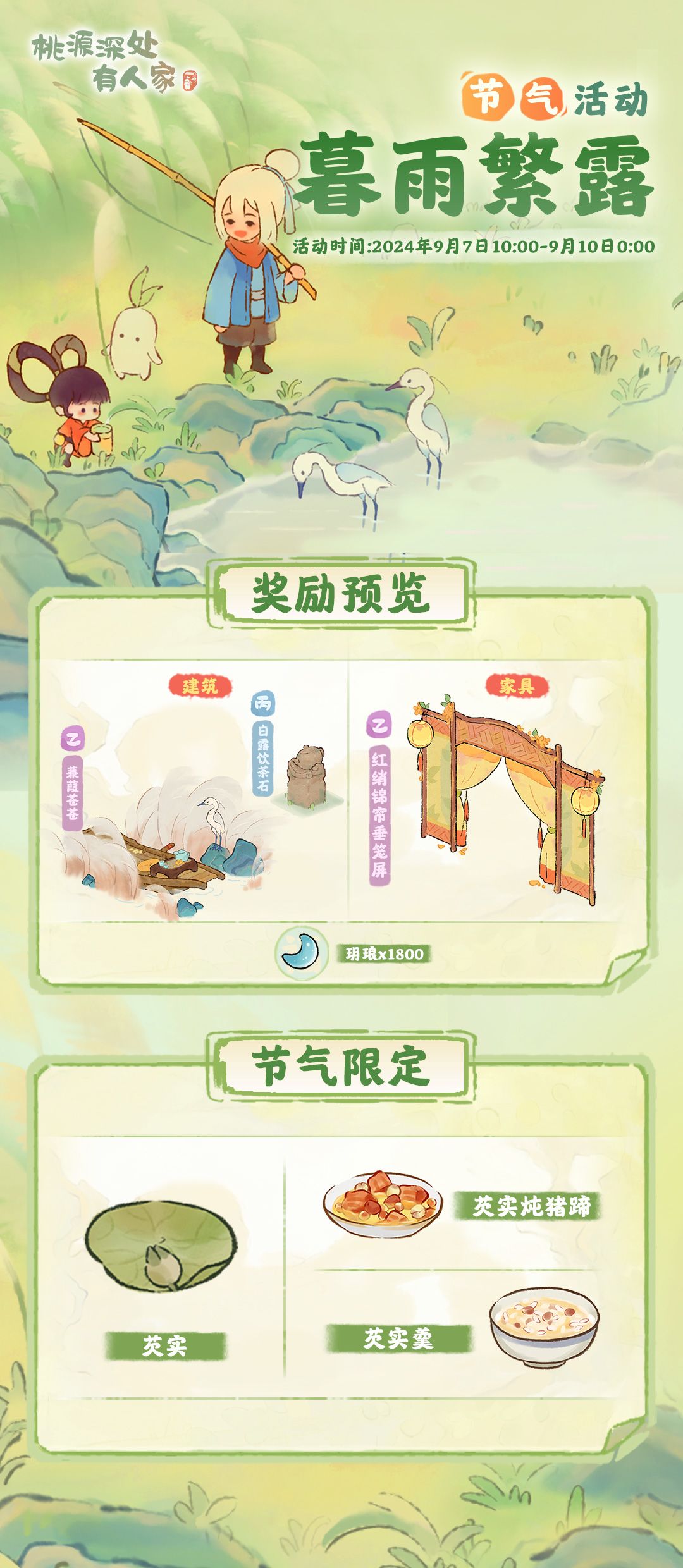 同时装饰商店将上线秋季家居套装「秋意盎然」中的「红绡锦帘垂笼屏」以及返场节气限定建筑「蒹葭苍苍」,山民们记得参与活动获取玥琅,不要错过兑换时间萝!