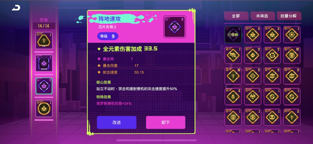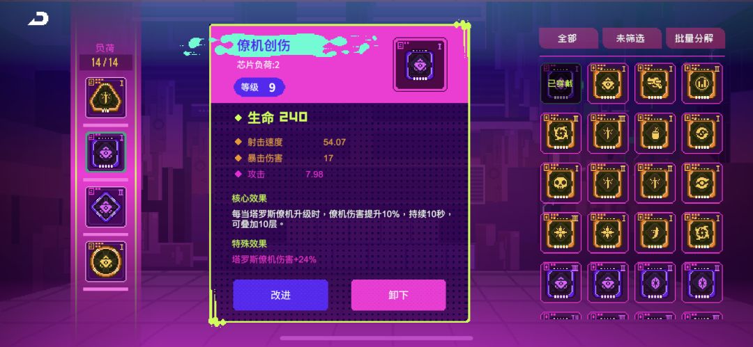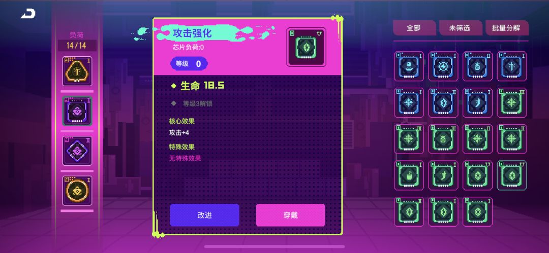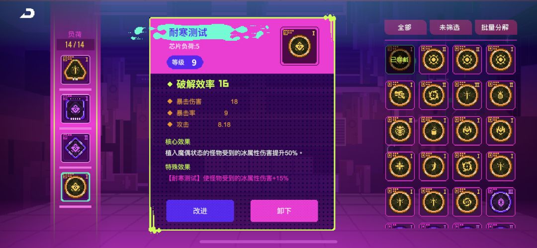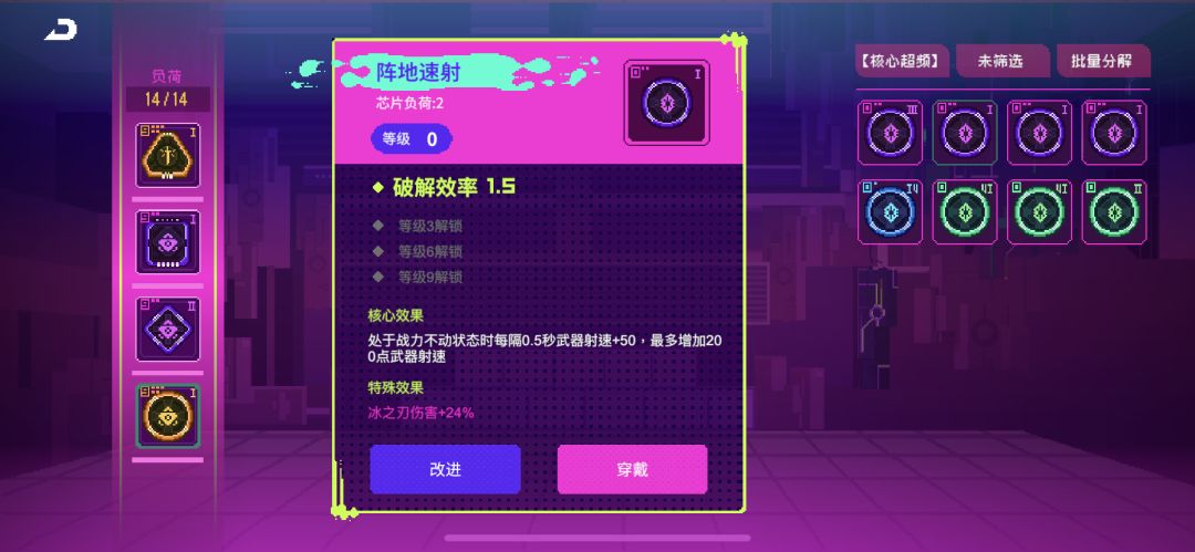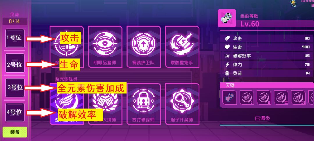 注意!每个人刷出的芯片效果或许是交叉的,又或者位置都不一样,你可以根据自己实际情况合理搭配。但要遵循这个顺序:1号位 > 4号位 = 3号位 >2号位,等级最高的芯片肯定是给1号位的,因为攻击力加的多。其次4和3号位加破解和伤害,最后2号位放等级最低的因为加生命没啥用。