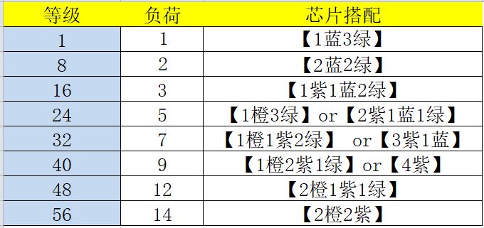 以上,是我推荐的 橙色、紫色、蓝色、绿色的芯片,大家可以根据自己的负荷,按照下图,搭配上述芯片噢。