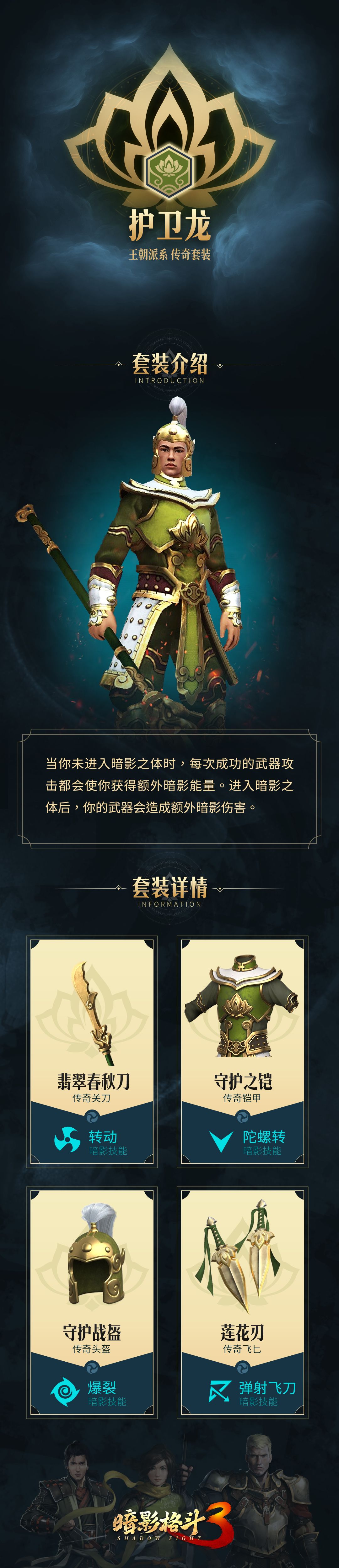 看完了山谷的精彩讲解,让我们一起来浏览一下护卫龙套装的具体技能吧!