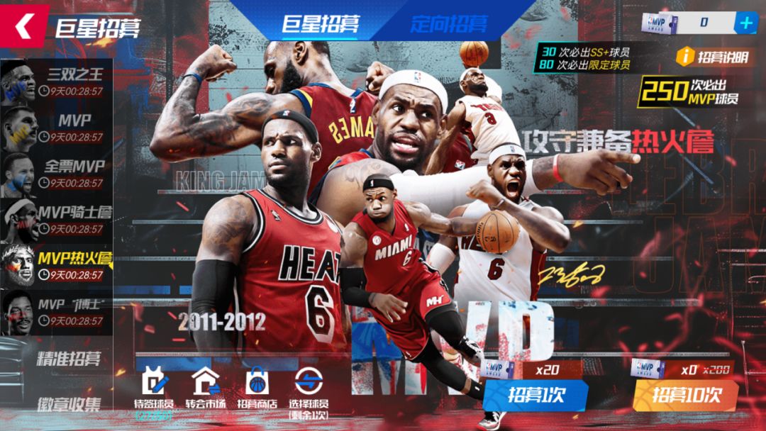 MVP卡池全员首次十连免费!至多抽取250次,成功将MVP热火詹签约入队!130抽必出SS+限定球员,每30抽必出大师球员!