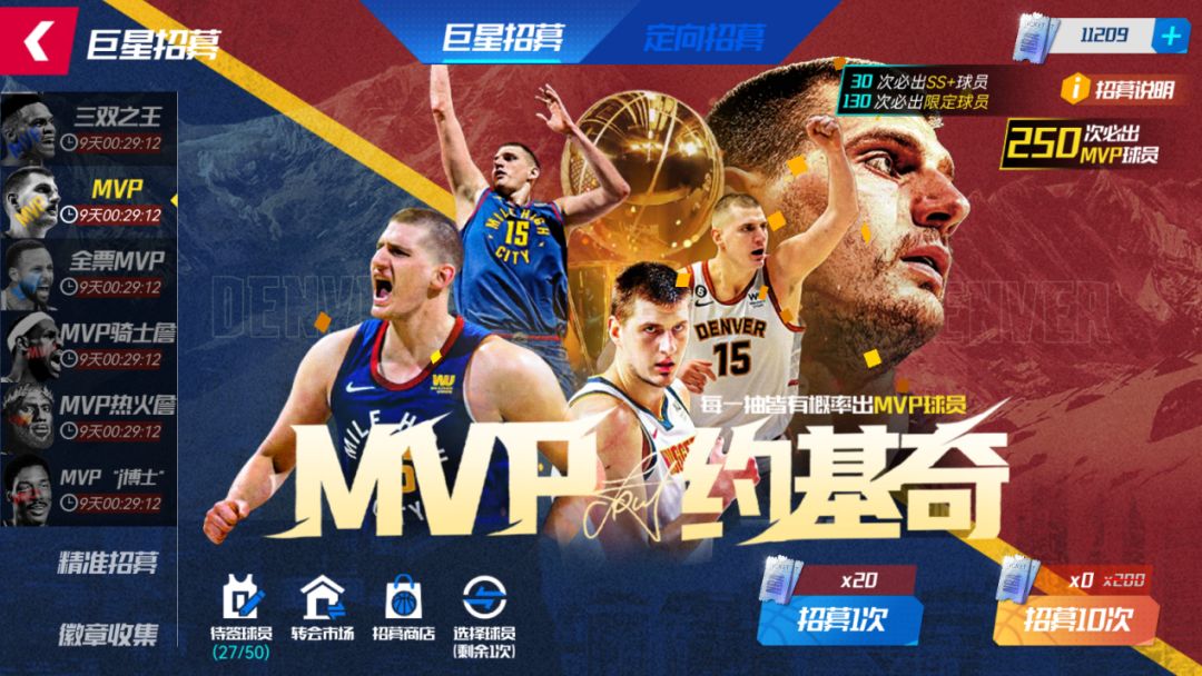 活动期间,可使用【点券】在【MVP招募】池中,招募MVP约基奇。MVP卡池全员首次十连免费!至多抽取250次,成功将MVP约基奇签约入队!130抽必出SS+限定球员,每30抽必出大师球员!