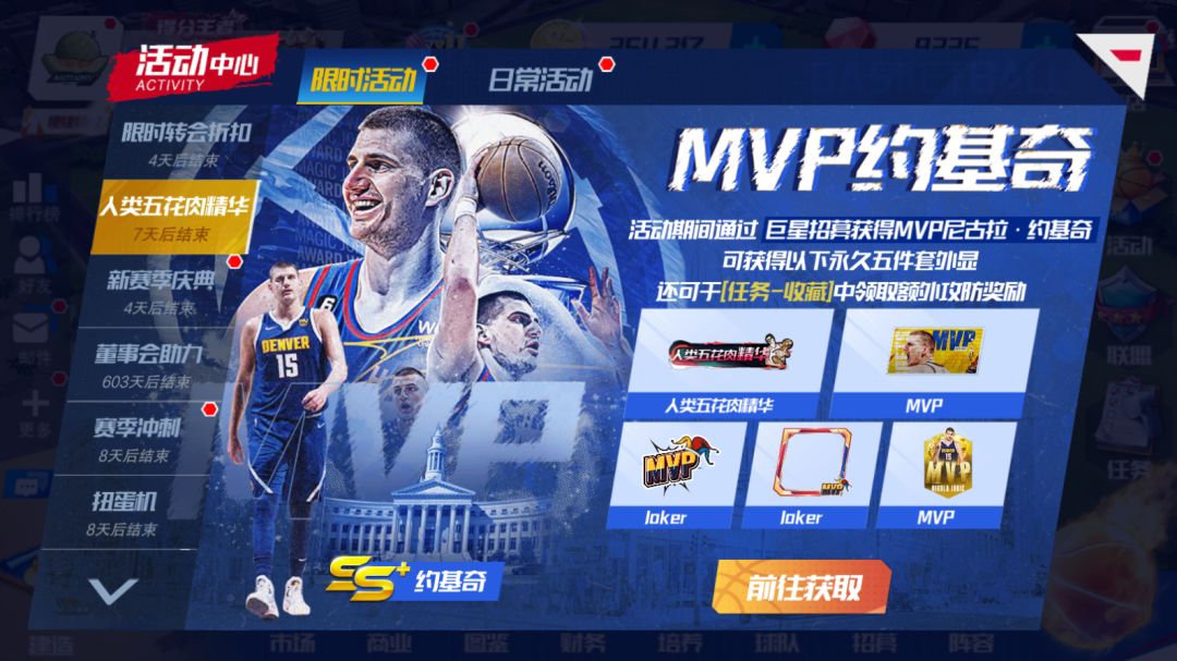 活动期间通过巨星招募获得MVP限定SS+约基奇,可领取MVP约基奇永久外显五件套(称号、头像、头像框、背景板和专属球员形象)。
