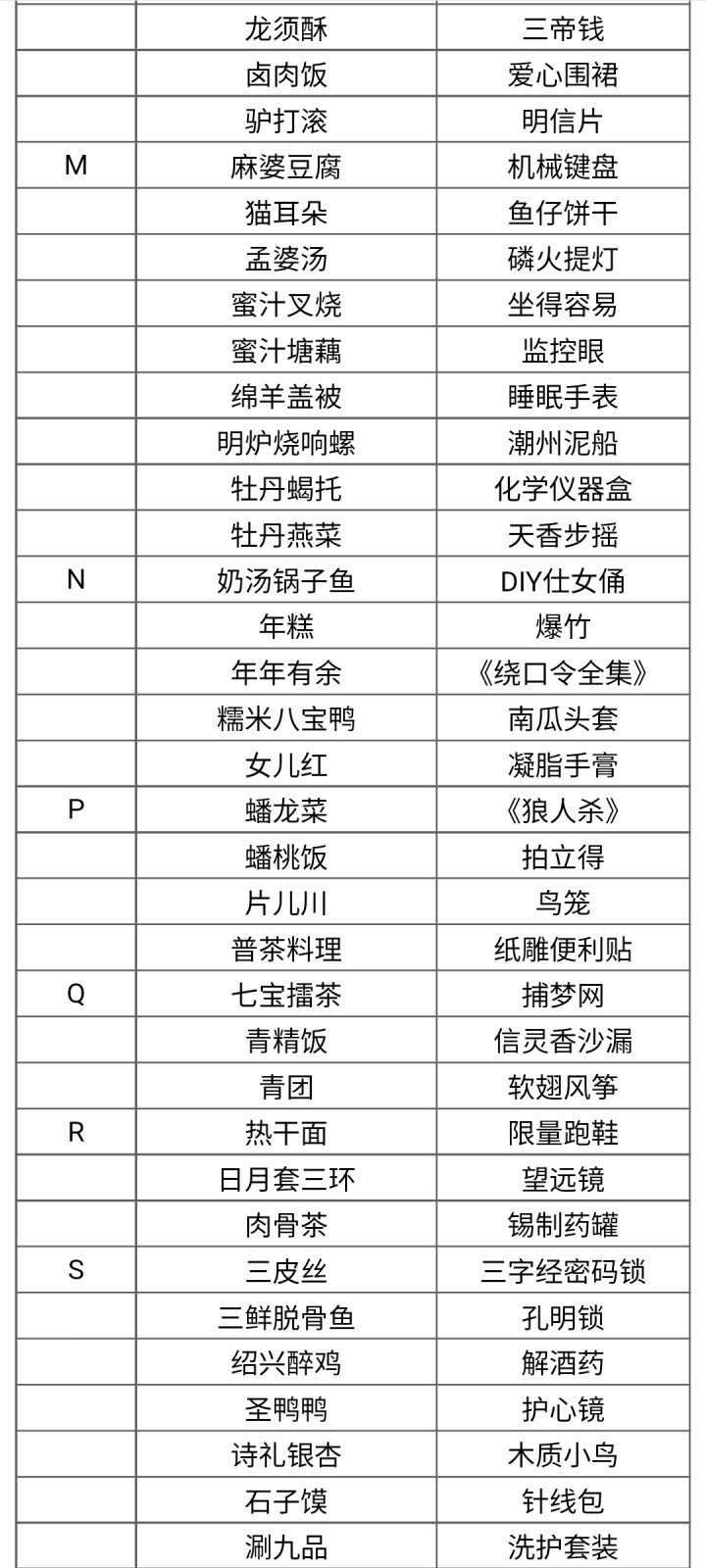 此表为按食魂名字首字母顺序排列的全食魂赠礼表。