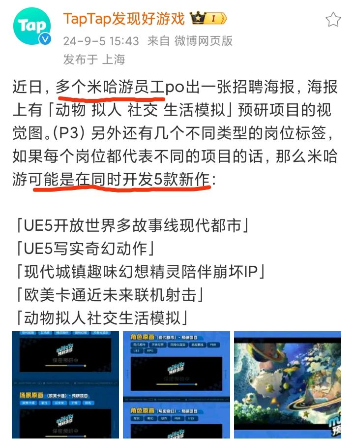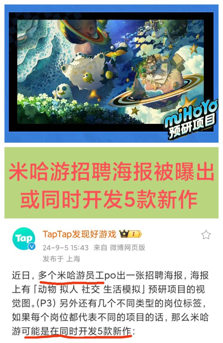 9/5号下午,TapTap官博发文称,米哈游或在同时开发五款新游❗❗❗