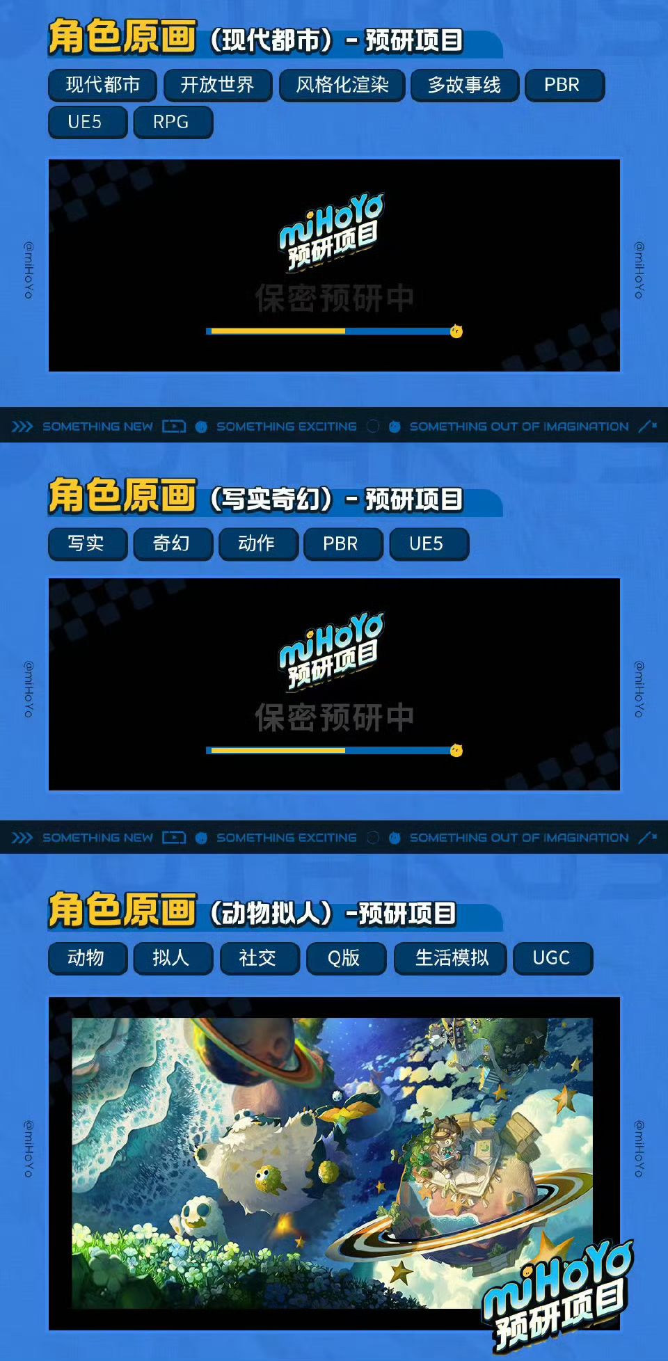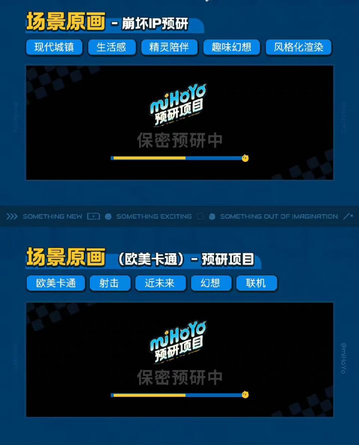 起因是多个米哈游员工曝出招聘海报,由于5个职位标签各不相同,米哈游可能在同时开发5款新作