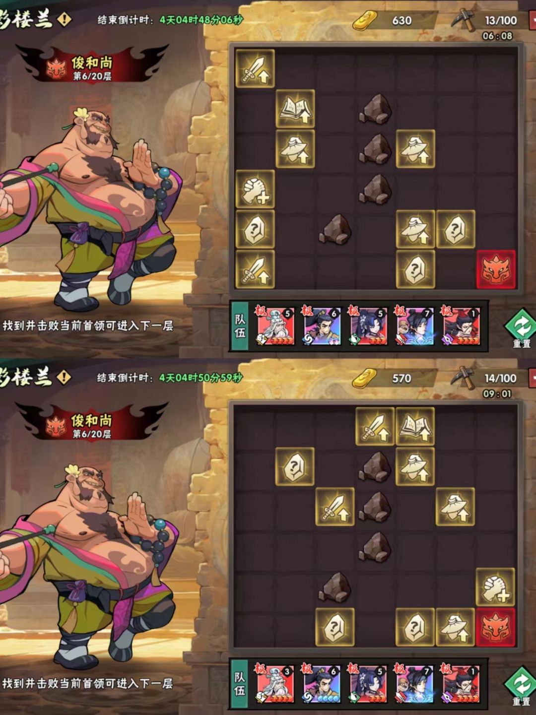 保证清怪效率高,那么前面几层拿功法buff、拿增强buff就要适当的选择性大退,打造的队伍越强,清怪能力自然越高。