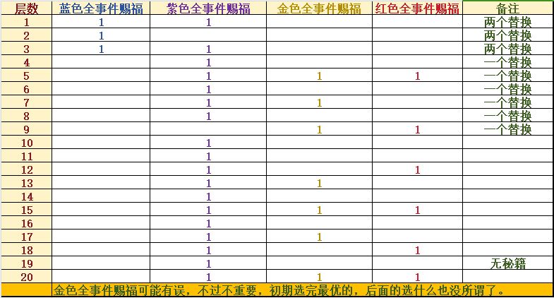 表中,如果把蓝色、金色、红色全英雄赐福全部对照,会玩起来极累,建议只重视红色赐福就可以了。