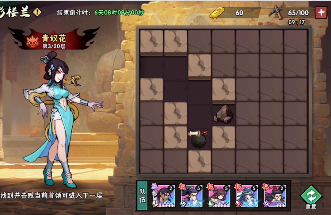 注意怎么憋炸弹效益最高、不碰巨岩,按照每层的buff数来取舍剩下的石头还要不要挖等等(每层的功法buff还是要拿),以节省锄头(叶子)的最高性价比,适当用大退法,稳步下层。