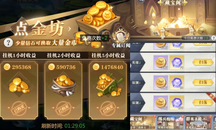 2、除了购买物品,每天点金坊都要点满,暴击了就血赚。点金坊的刷新时间,每天0点、12点与18点刷新点金坊次数,首月开荒期建议都点满。千万不要拿钻石去小卖部高级召唤;