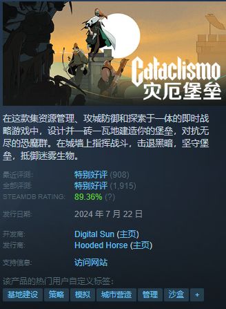 《灾厄堡垒》(Cataclismo),初看《亿万僵尸》,细玩《要塞》风味。官方原话是“集资源管理、攻城防御和探索于一体的即时战略游戏”,简单来讲,建造加塔防加即时战略。