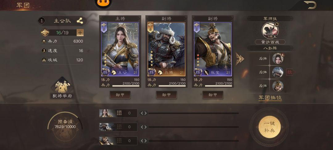 接下来是阵型的选择:容错低可以使用八卦阵,由于游戏机制主将阵亡,就会失败,开荒时要注意对面阵型,对面主动伤害较多则阵型为八卦阵,普攻连击伤害较多则阵型为混元阵,长蛇阵一般为核弹爆发队使用,不推荐开荒期使用,战损较高。