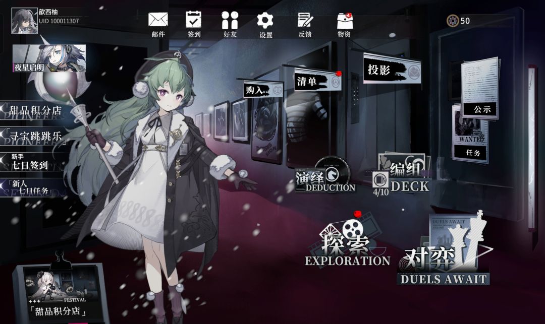 投影是卡池,任务是每周每日奖励,购入是氪金商店,探索是PVE副本和剧情地图探索,公示是公告
