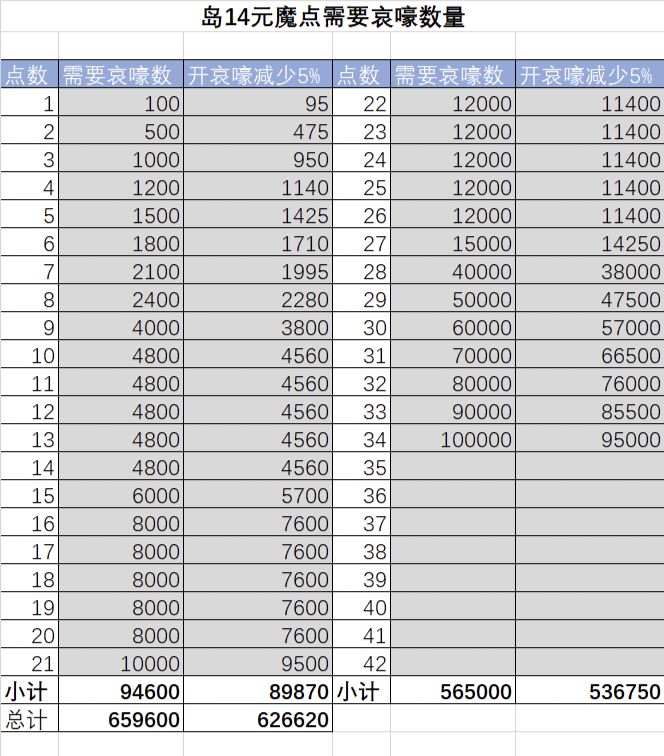 中期:进入此阶段,需要自我斟酌计算,其中包括想要集齐多少张藏宝图,以及重置元魔后加上现有哀嚎,共可以点出多少点元魔,对照文末“各元魔点需要哀嚎数量”表格(此表格为博佬精心制作),低配版需要25点,可点出9黄9红9蓝(直通大天赋),中高配版只需要24点。重点:重置节点需要个人自己把握,比如藏宝图碎片尽量不溢出的情况或忍不住想开始肝清剿等,建议永夜倒计时开始时重置,留出三四天时间疯狂清剿所有等级岛屿,一二级必清剿,根据自身实力酌情清剿三四级。所有的清剿箱子单次以10个或以上单位开启,避免核心过少,螺丝等材料过多。