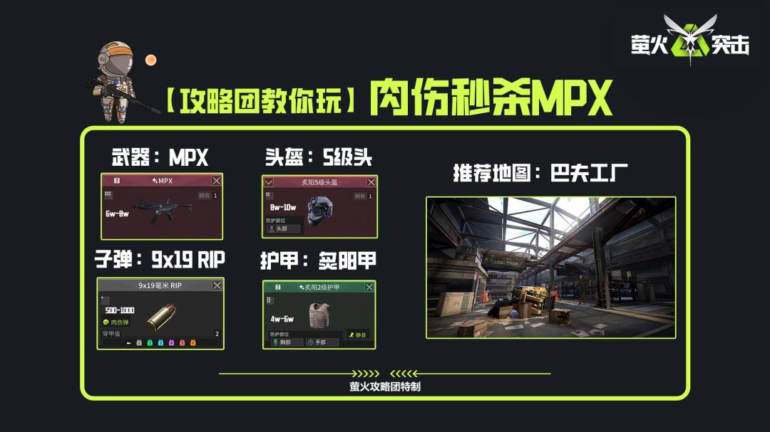 MPX是一把高射速冲锋枪,可以搭配肉伤弹对无防护部位造成较高伤害,我们改装上BGV垂直握把和MPX握把,可以让进阶辅助瞄准腿部伤害概率达到90%,除了普瑞德护甲外,没人可以抗几枪。本期萤火攻略团将在医药公司地图中教你玩转MPX肉伤弹,制霸工厂,无惧刀仔!