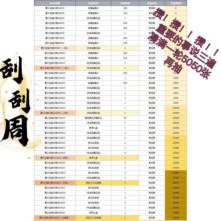 这个活动不用说太多,看图。总而言之,积攒足够多的刮刮券,一次性抽满,拿最高奖励