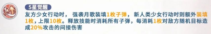 友方少女行动时,强袭月歌装填1枚子弹,新人类少女行动时则额外装填1枚,上限10枚。释放技能时消耗所有子弹,每消耗1枚对敌方随机目标造成20%攻击的间接伤害