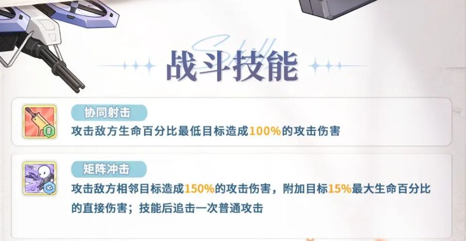 己方新人类少女行动时,强袭月歌50%概率追击1次普攻,每回合上限5次;