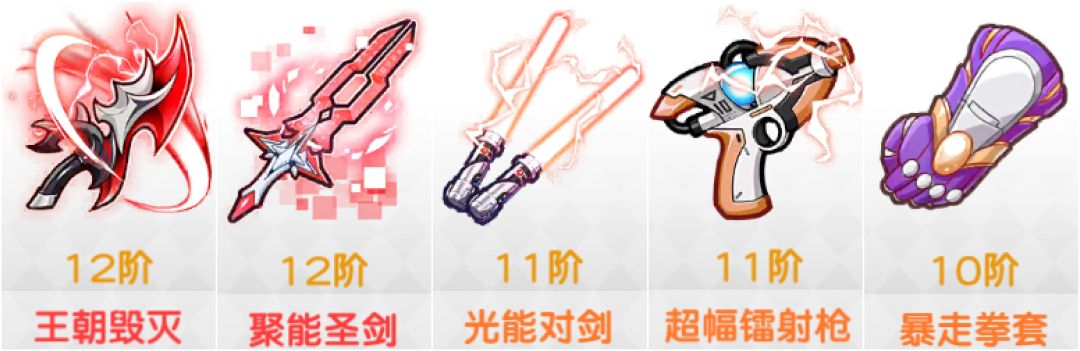 【王朝毁灭】>【聚能圣剑】>【光能对剑】>【超辐镭射枪】>【暴走拳套】