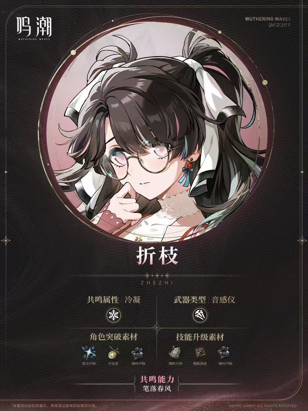 折枝的突破素材包括贝币、啸叫声核(低频、中频、高频、全频)以及留音声核和灯笼果。天赋素材则包括贝币、啸叫声核系列和不同速度的涡流系列。在培养过程中,确保获取足够的素材以提升角色等级和天赋等级是关键。